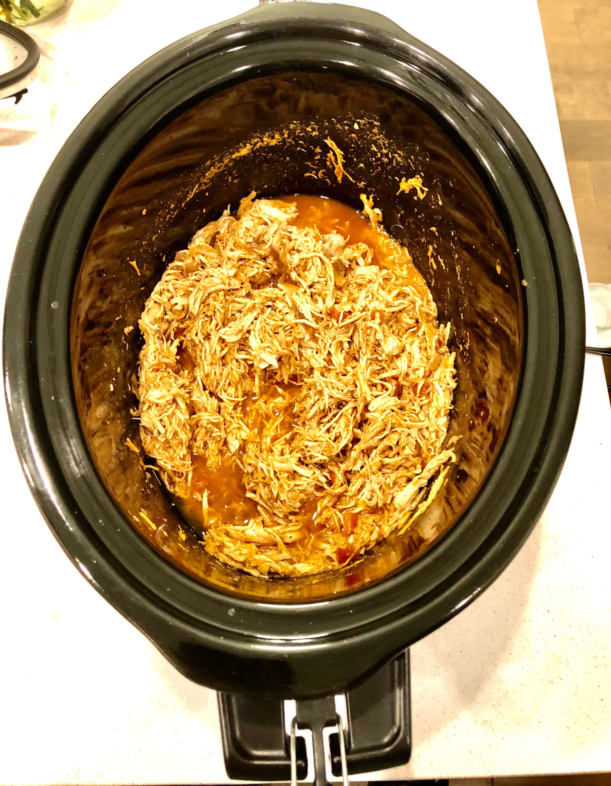 6) (optional and potentially unhealthy based on the choice of the mix) Get your favorite taco mix, add a bit of water (enough so that it is not chalky or pasty), give it a nice stir, and add it in the shredded chicken. Mix and cook on low for about 5 min.